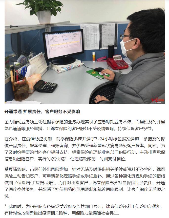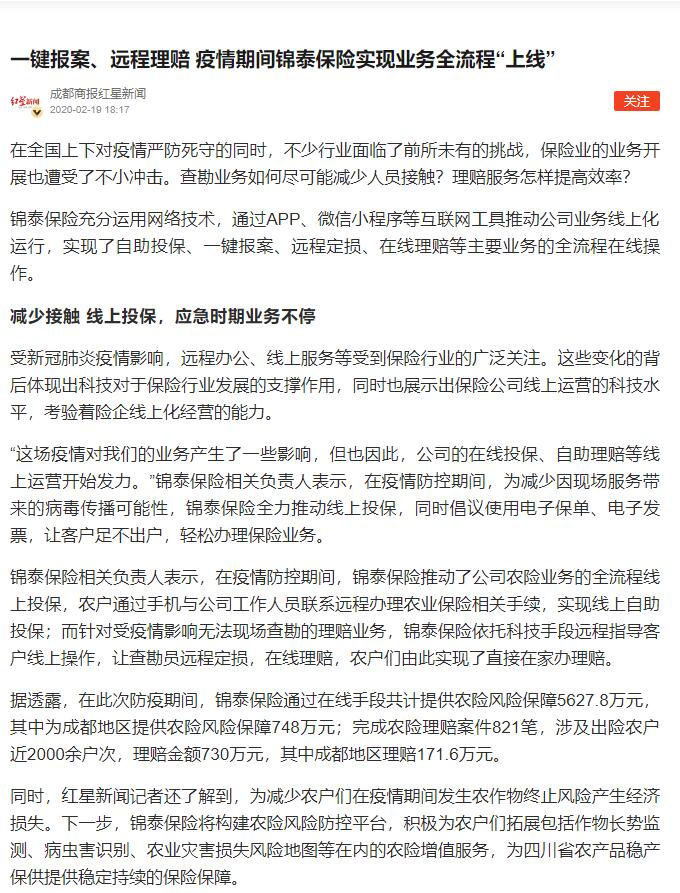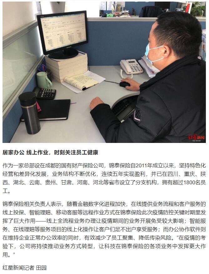 成都商报红星新闻∣一键报案、远程理赔 疫情期间锦泰保险实现业务全流程“上线”