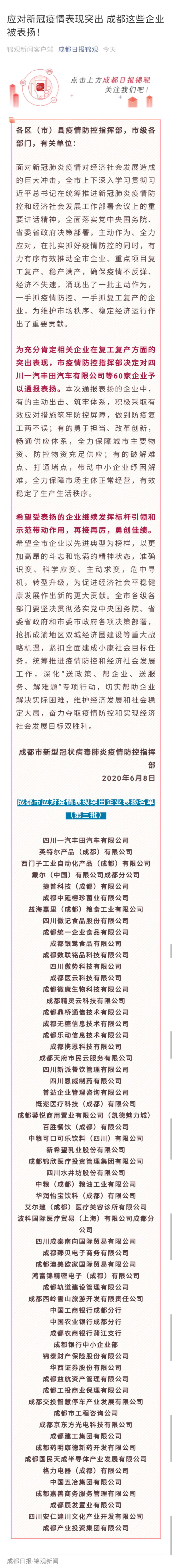 成都日报∣应对新冠疫情表现突出 成都这些企业被表扬!