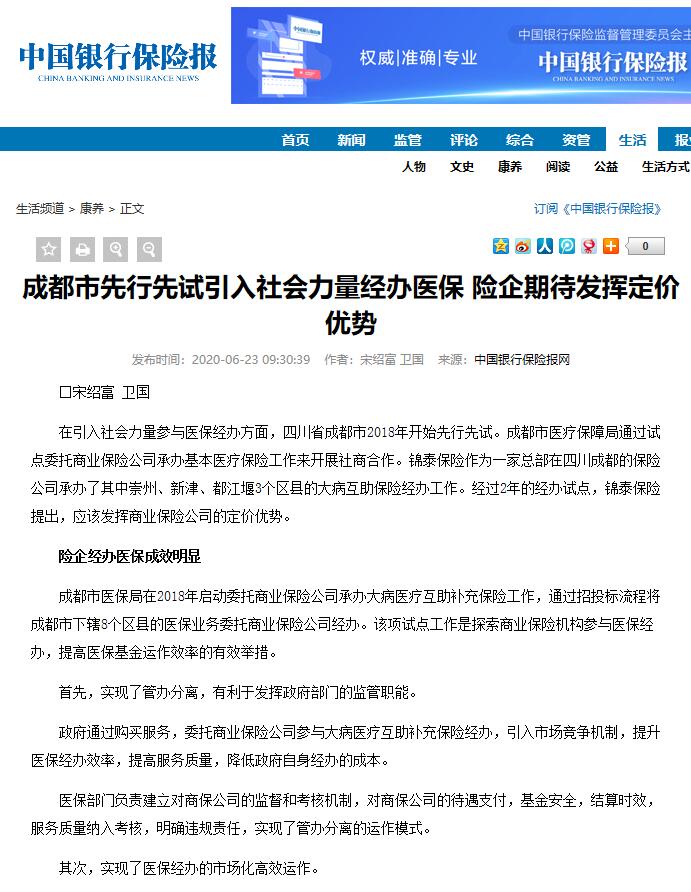 中国银行保险报∣成都市先行先试引入社会力量经办医保 险企期待发挥定价优势