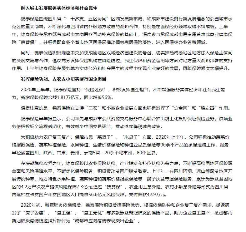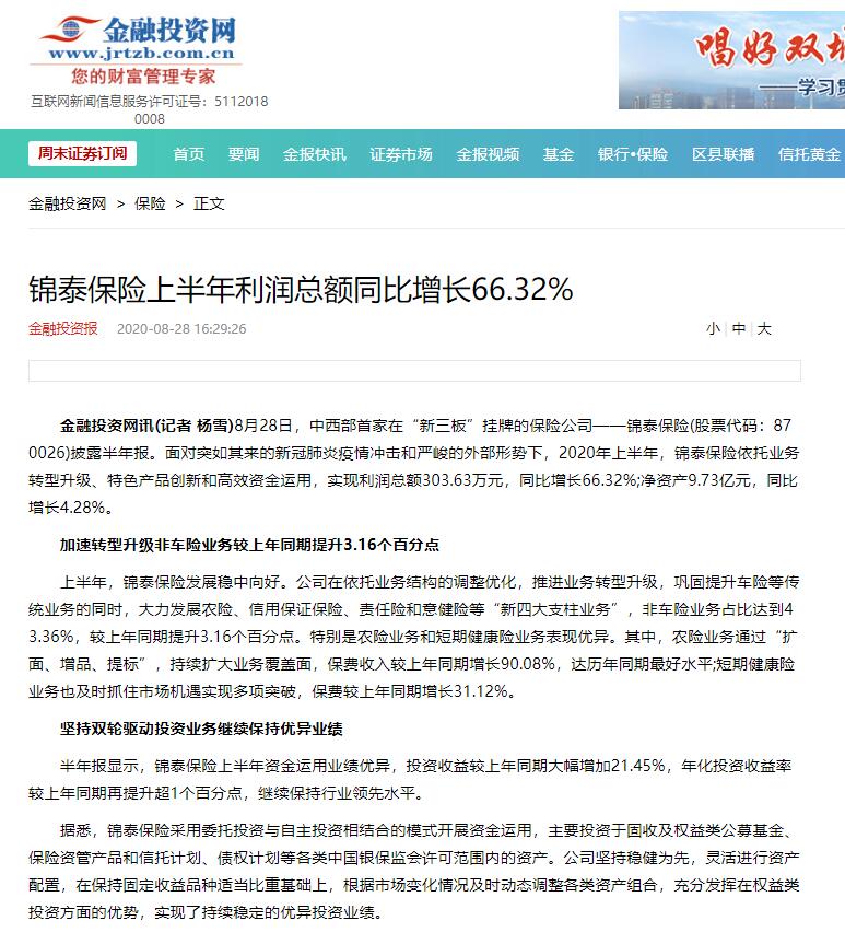 金融投资报∣锦泰保险上半年利润总额同比增长66.32%