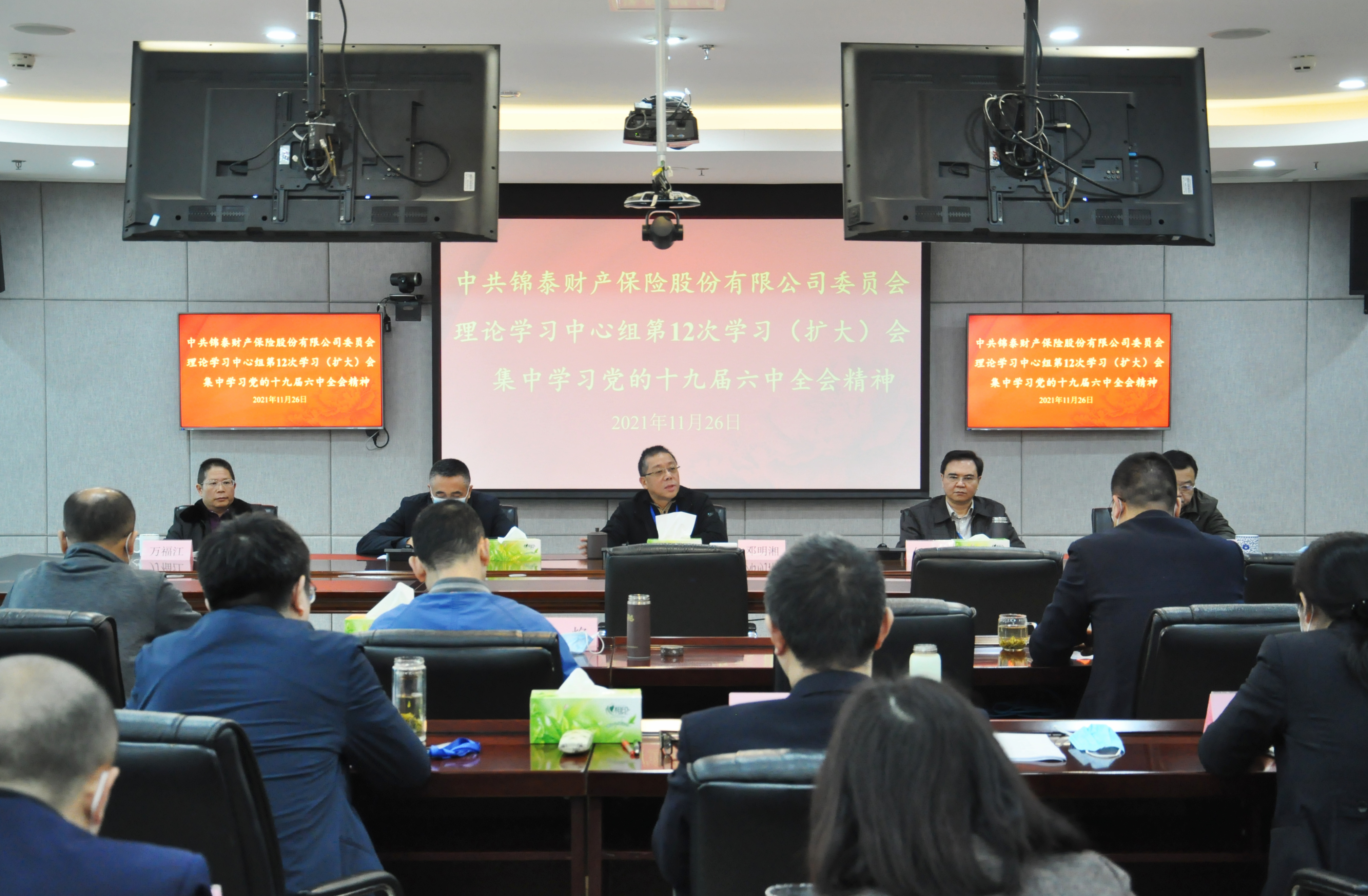2021年11月26日,锦泰保险召开第12次党委理论学习中心组学习(扩大)会议,专题集中学习党的十九届六中全会精神,公司党委书记、董事长邓明湘主持会议并作总结讲话。理论学习中心组成员参加会议,经理层成员及总公司各部门负责人列席会议。