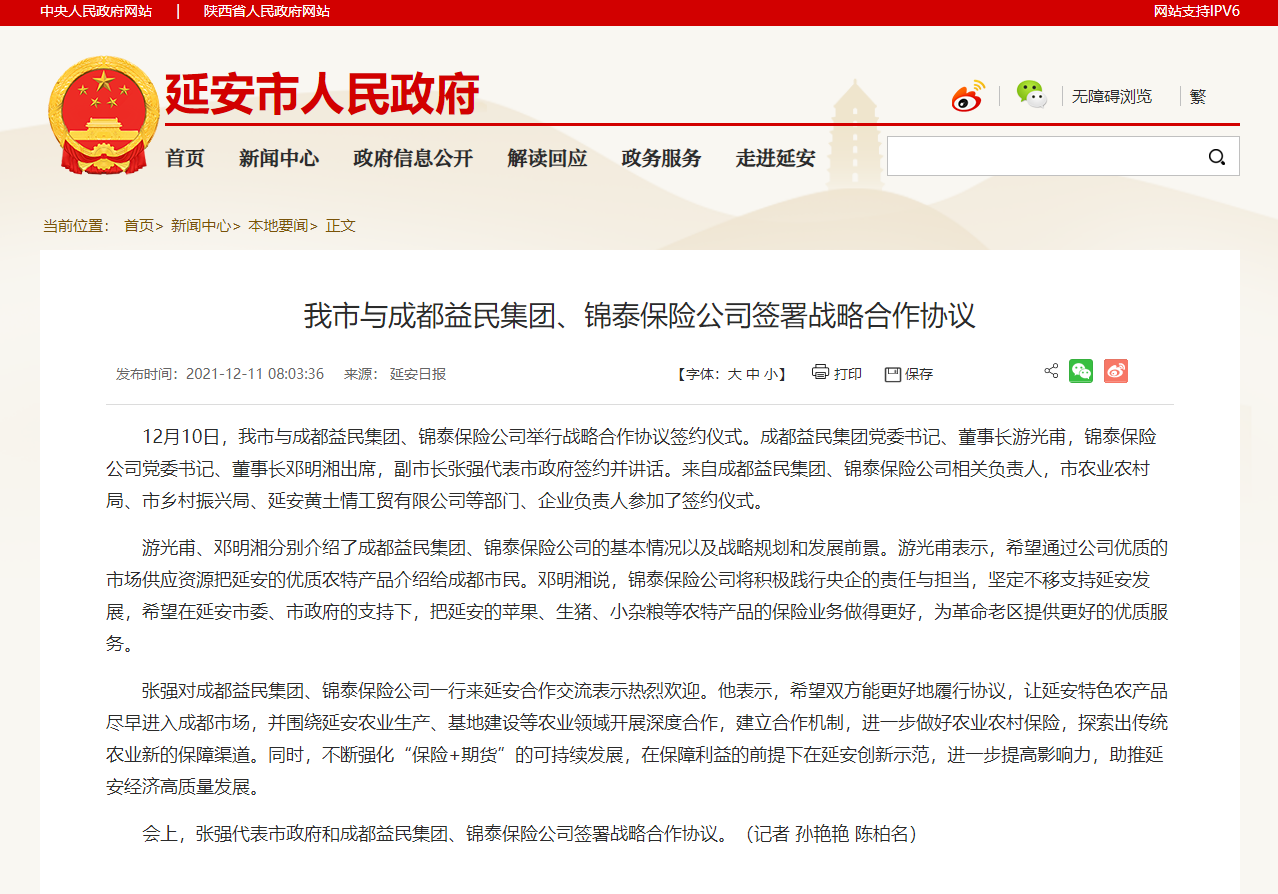 延安市人民政府丨延安市人民政府与成都益民集团、锦泰保险公司签署战略合作协议