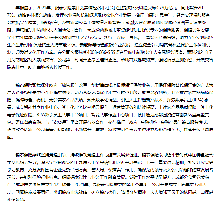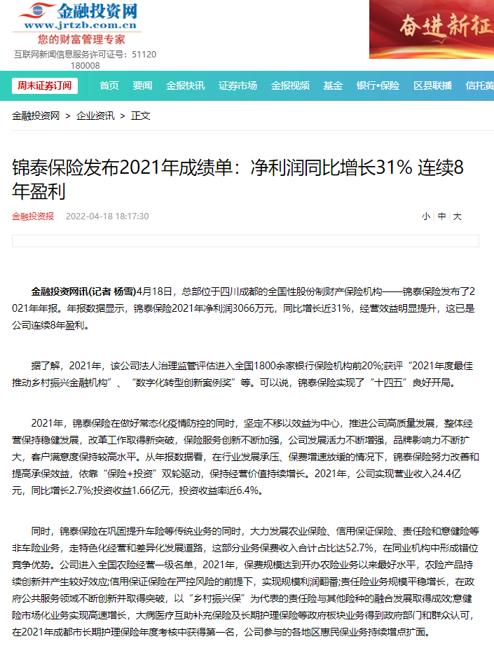 金融投资报丨锦泰保险发布2021年成绩单:净利润同比增长31% 连续8年盈利