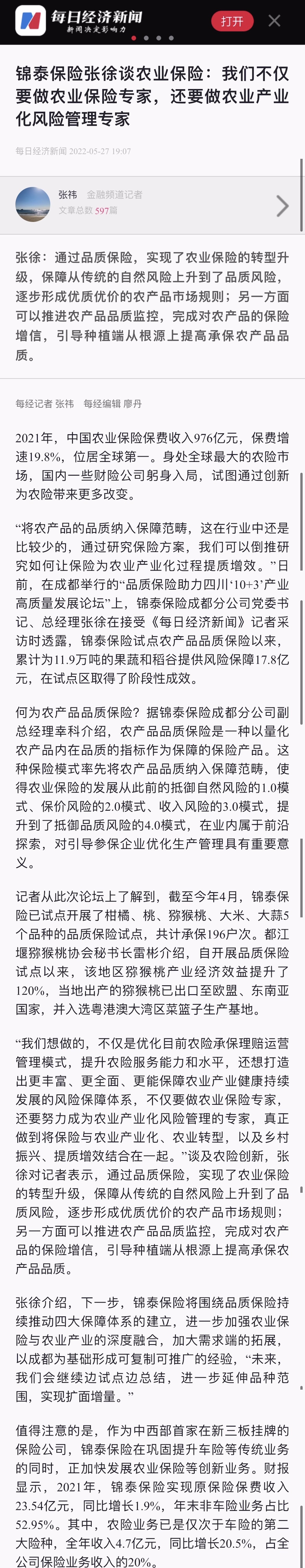 每日经济新闻丨锦泰保险张徐谈农业保险:我们不仅要做农业保险专家,还要做农业产业化风险管理专家