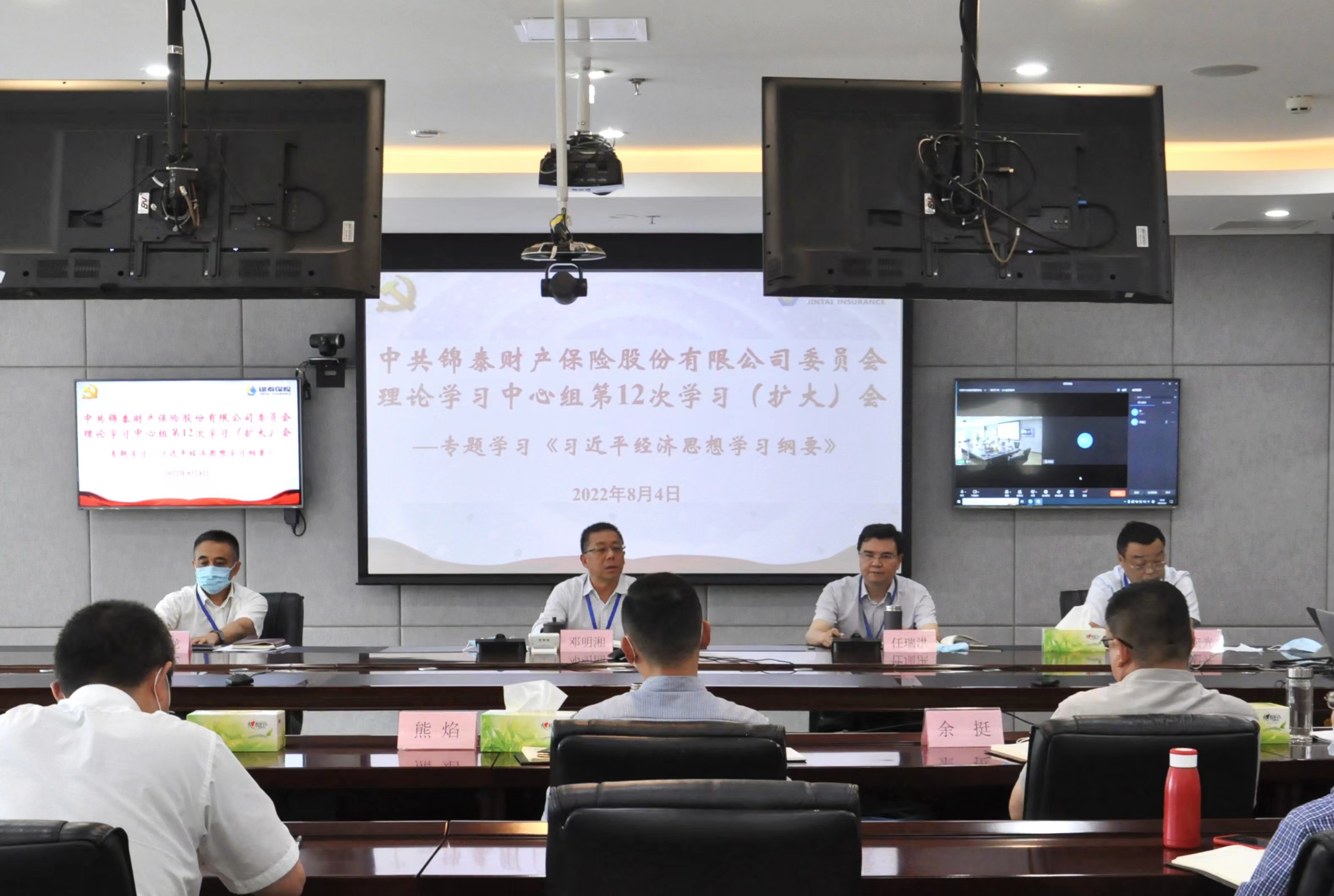 2022年8月4日,锦泰保险公司党委理论学习中心组举行专题学习会,集中学习《习近平经济思想学习纲要》。公司党委书记、董事长邓明湘主持会议并作总结讲话。公司党委副书记、总经理任瑞洪和副总经理宋绍富围绕学习主题分别作交流发言。