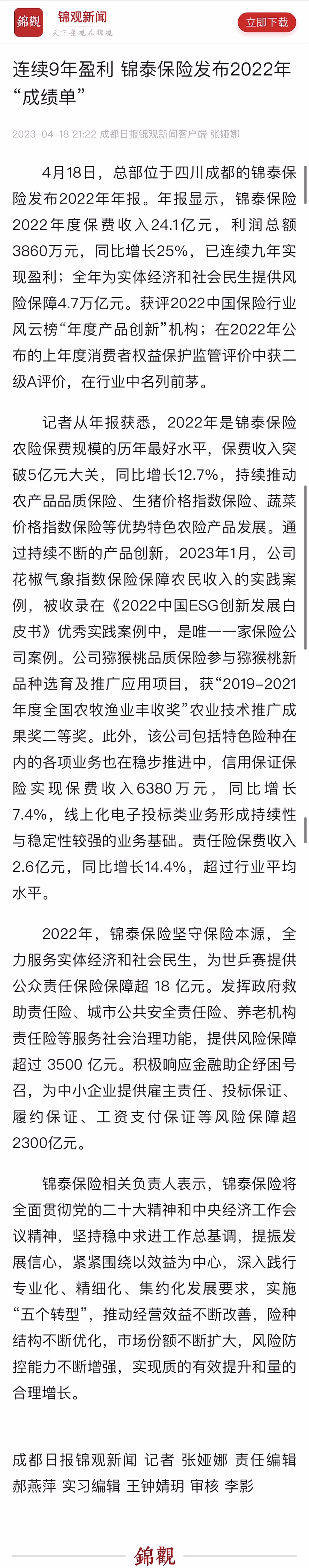 成都日报丨连续9年盈利 锦泰保险发布2022年“成绩单”