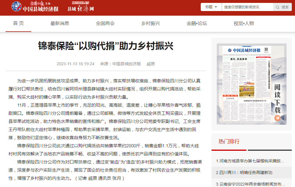中国县域经济报丨锦泰保险“以购代捐”助力乡村振兴