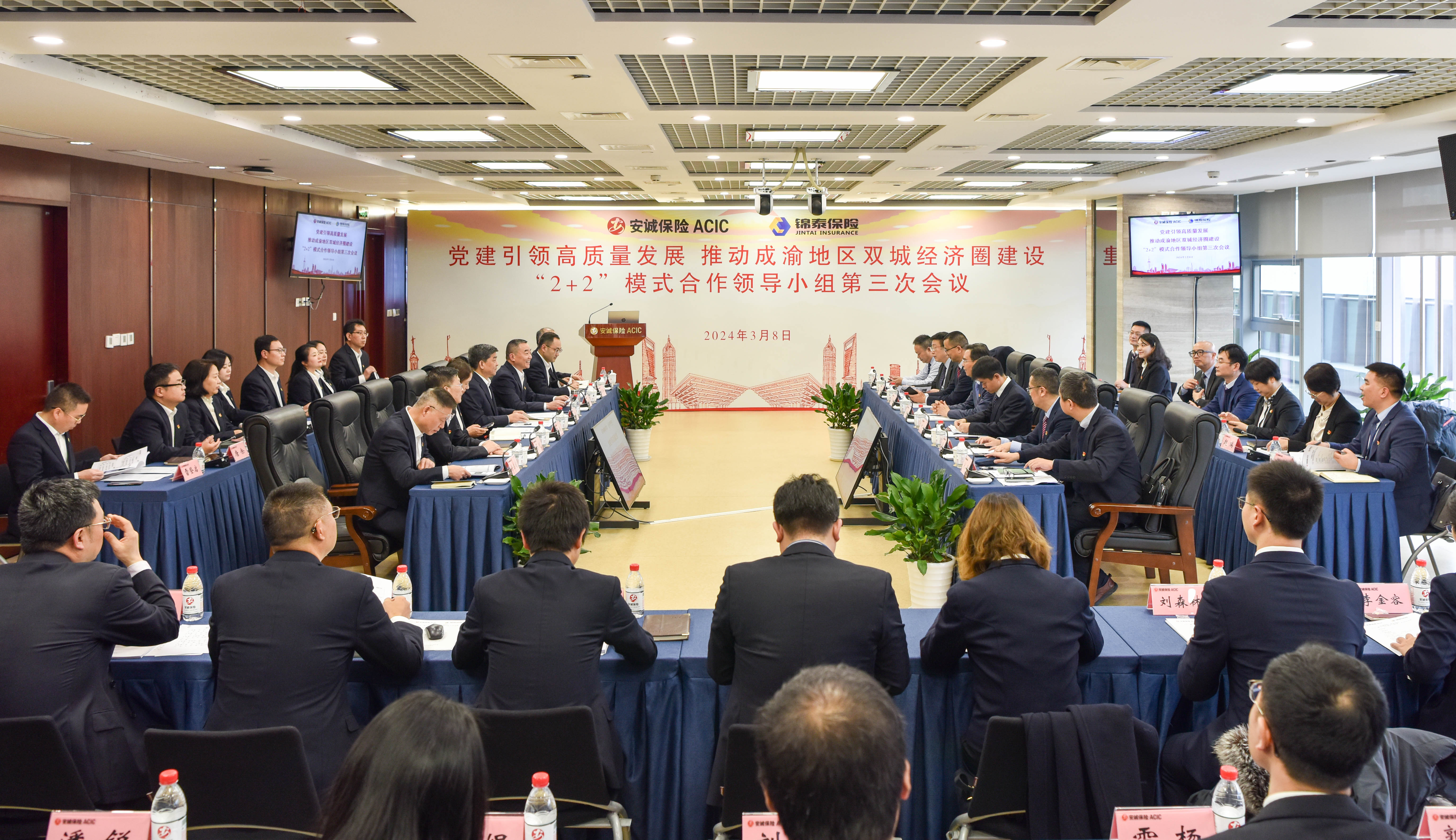 2024年3月8日下午,锦泰保险与安诚保险“2+2”模式合作领导小组第三次会议在安诚保险重庆总部召开。安诚保险党委书记、董事长周平,锦泰保险党委书记、董事长任瑞洪出席会议并讲话。安诚保险党委副书记、工会主席林翔主持会议。锦泰保险副总经理(主持工作)、首席投资官宋绍富,安诚保险党委委员、副总经理薛春,党委委员、拟任副总经理李昊轩出席会议。