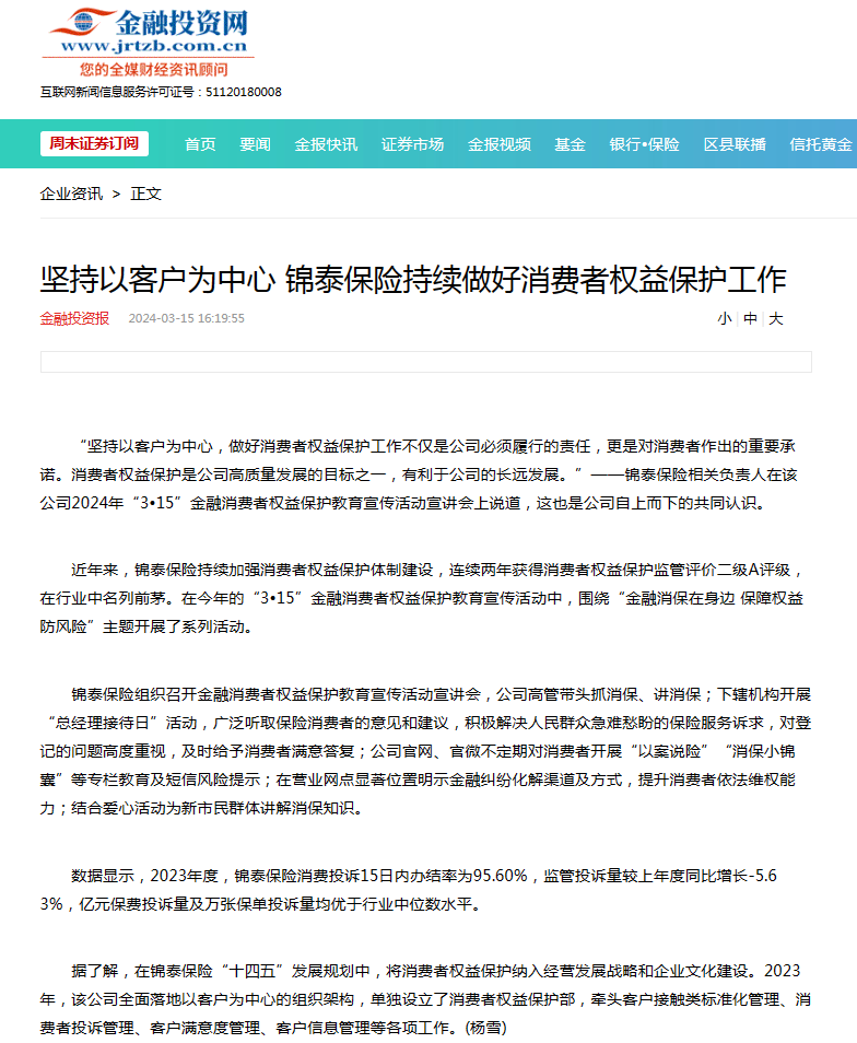 金融投资网丨锦泰保险持续做好消费者权益保护工作