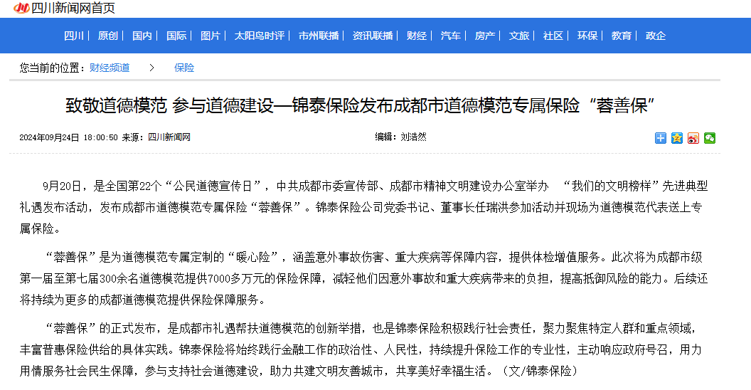 四川新闻网丨致敬道德模范 参与道德建设—锦泰保险发布成都市道德模范专属保险“蓉善保”