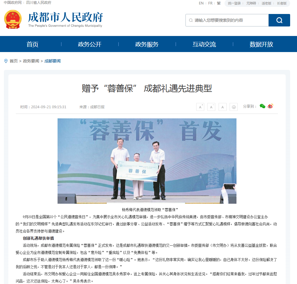 成都市人民政府丨赠予“蓉善保” 成都礼遇先进典型