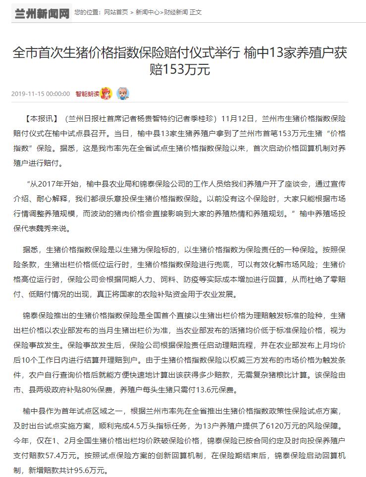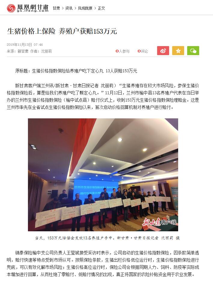 兰州新闻网、凤凰网、甘肃经济信息网等多家媒体∣兰州市首次生猪价格指数保险赔付仪式举行 榆中13家养殖户获赔153万元